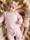 Conjunto tejido tres piezas que incluye buzo y pantalón, acompañado de un gorrito con pompón. Su detalle bordado de moño le da un aire clásico y delicado. Disponible en rosado y blanco, es suave, cómodo y especial para regalar o para las primeras fotos o para momentos únicos de tu princesa.