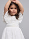 Vestido en ojalillo 100% algodón con hermosos boleros en las mangas y fajón elegante que puede ser color blanco o palo de rosa. Es ideal para bautizos o eventos especiales como bodas.