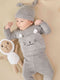 Un hermoso set de tejido de bigotes, en color gris, de tres piezas que incluye gorro, pantalón y buzo. Prendas para abrazar cariñosamente a tu bebé.